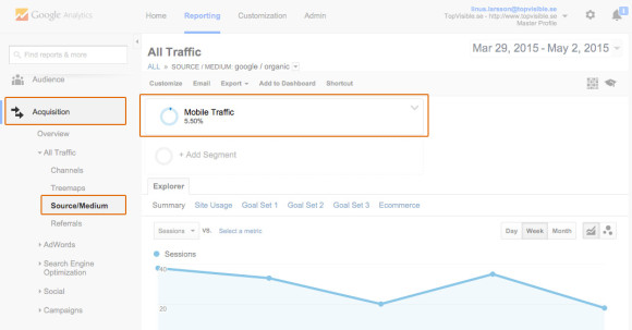 Först och främst ska vi berätta vad exakt det är vi kollat på. Istället för att stirra oss blinda på ranking har vi valt att se på hur den faktiska trafiken påverkats. Vi kollar antalet besök som kommer från organiska Google-träffar (source/medium = Google/organic) och segmenterar sen fram mobiltrafiken. Du kan göra samma koll på ditt eget konto genom att gå till Acquisition > All traffic > Source/Medium. Klicka sen på + Add Segment, kryssa ur All sessions och kryssa för Mobile Traffic.