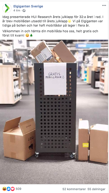 Jag tror ingen har lyckats undgå att mobillådan blev utsedd till årets julklapp 2019 av HUI. Jag tror heller ingen har lyckats undgå hur företag efter företag har passat på att rida på denna våg. Det har minst sagt varit delade meningar om mobillådan. Jag tycker i alla fall inlägg likt Elgigantens ovan är fantastiskt roligt! Läs mer om årets julklapp här.