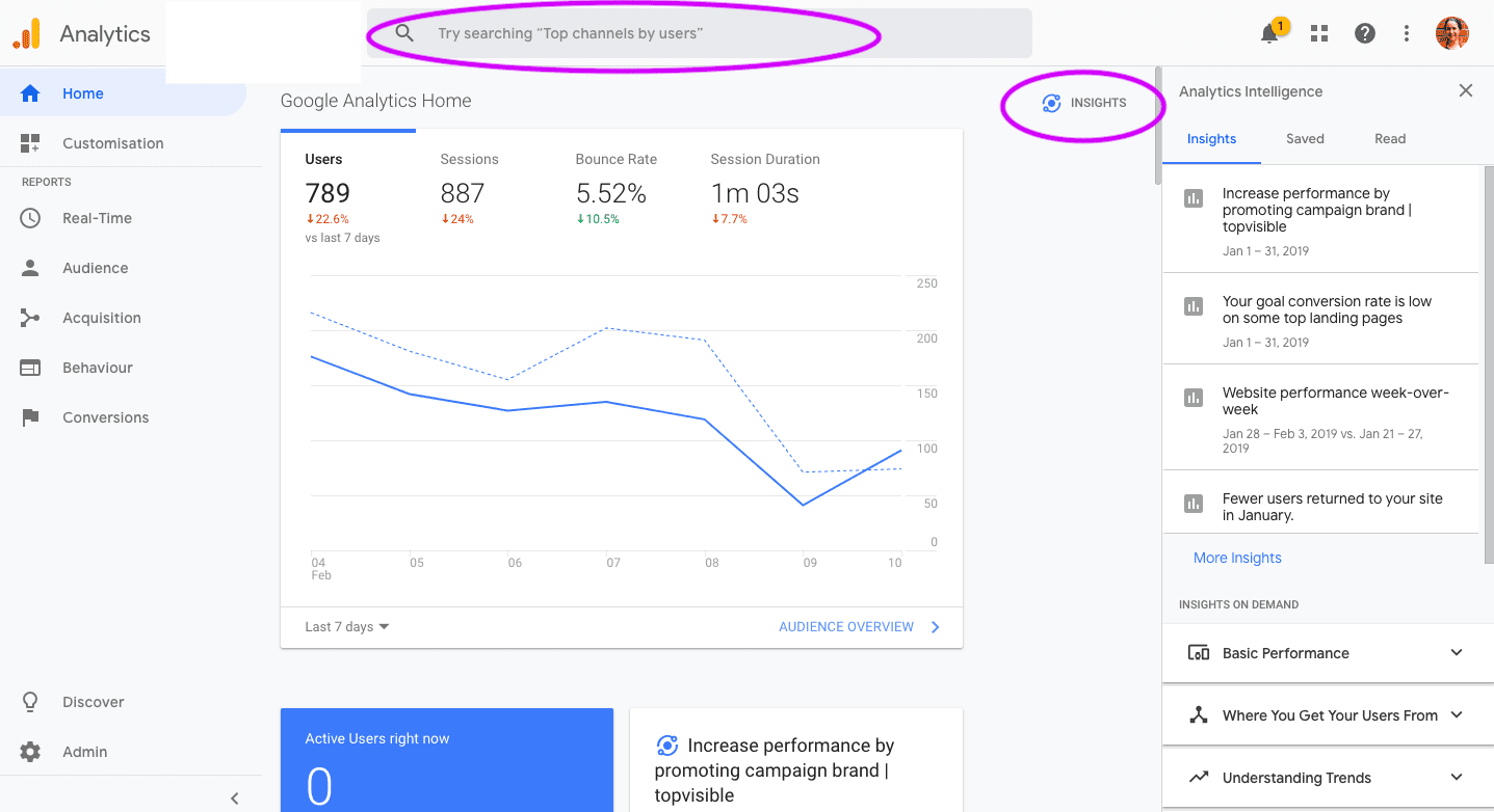 Det finns inte i alla konton ännu (eller på alla språk för den delen) men håll utkik efter en knapp där det står “insights” på Analytics startsida och börja ställa dina frågor!
