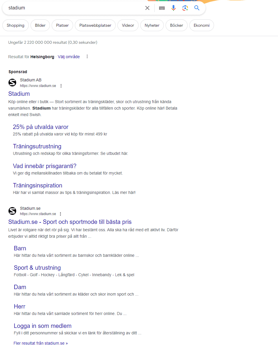 Stadium är ett bra exempel som visar på hur det kan se ut när man ligger etta i det organiska men också annonserar. Det organiska visar kategorier medan den sponsrade länken har sitelinks som pratar om kampanjer, inspiration och USP:ar som prisgaranti.