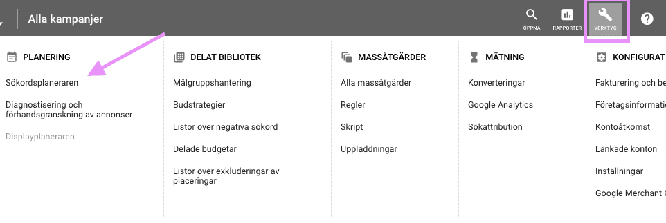 Här hittar ni sökordsplaneraren inne i Google Ads – under Verktyg.