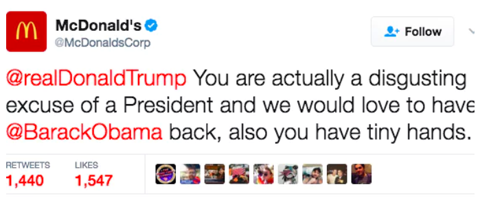 Vad gäller företags användande av sociala medier tycker jag mig ha sett en trend som innebär en mer personlig ton gentemot kunder och samarbetspartners. Jag tror att fler företag vågar använda sina sociala plattformar som en personlig röst åt sitt varumärke. Vissa tar också tillfället i akt att uttrycka sina personliga åsikter å sitt företags vägnar.. I mars förra året var det en anställd på McDonalds i USA som fick nog!